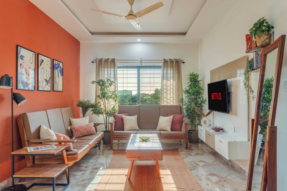 The spacious living room includes a 40-inch Smart TV and a dedicated workspace. An other hall features a dining table. The apartment is bathed in natural light and showcases a minimalist decor.