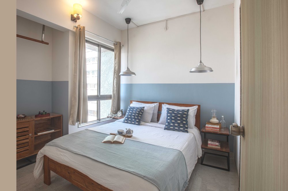 Modern 1 BHK apartment in Khar East. The bedroom comes with air conditioning, queen bed, high-thread-count sheets, and a plush orthopaedic mattress.